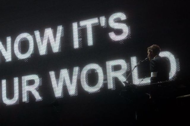 If a viewing of the Scottish play has people discussing the obsession of power then Massive Attack v Adam Curtis took a string of that theme and expanded upon it. After waiting for the curtains to open I found myself in a horseshoe of big screens, meaning the documentary is played all around the public, with the band behind the apex section. Adam Curtis’s film starts with the East and West in the 1960s. He quickly, and without debate, tells us how the two opposing sides want to control and change the world. Through a series of national events and interweaving personal stories we move onwards through history. As we go we’re told the governments realised they couldn’t control the world so they stopped making us worry about that “other side” and to panic over ourselves instead. When computer technology came along they tried to construct models to predict the future. Of course, they failed.
